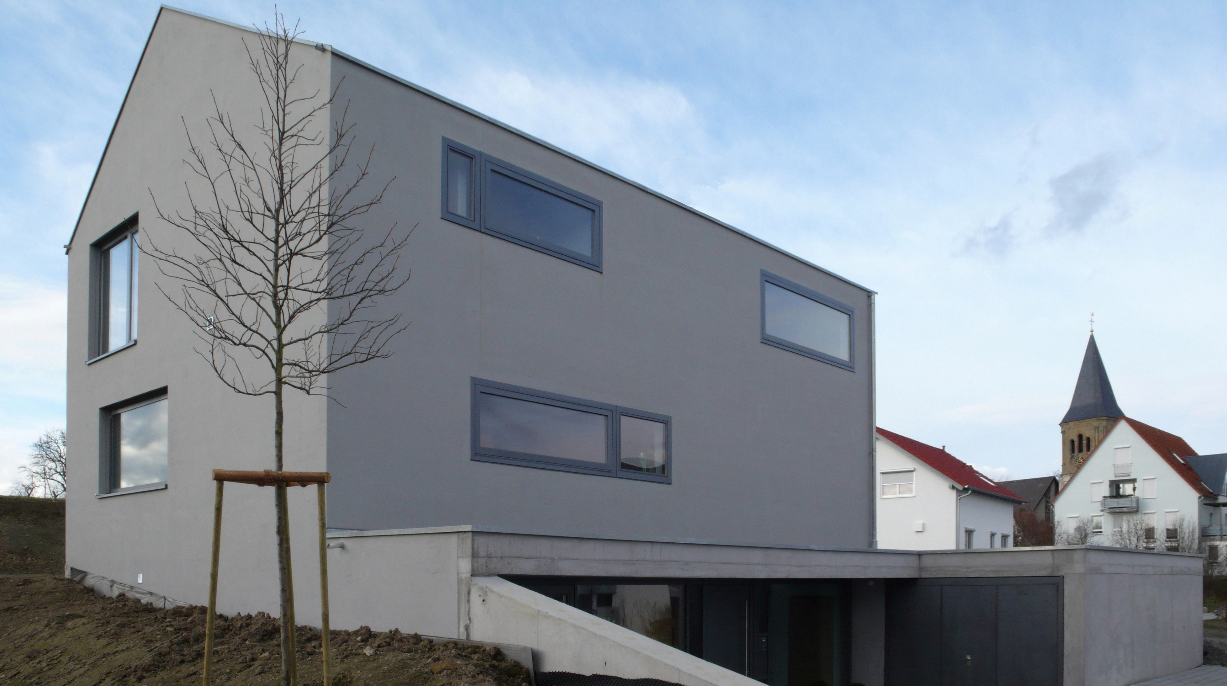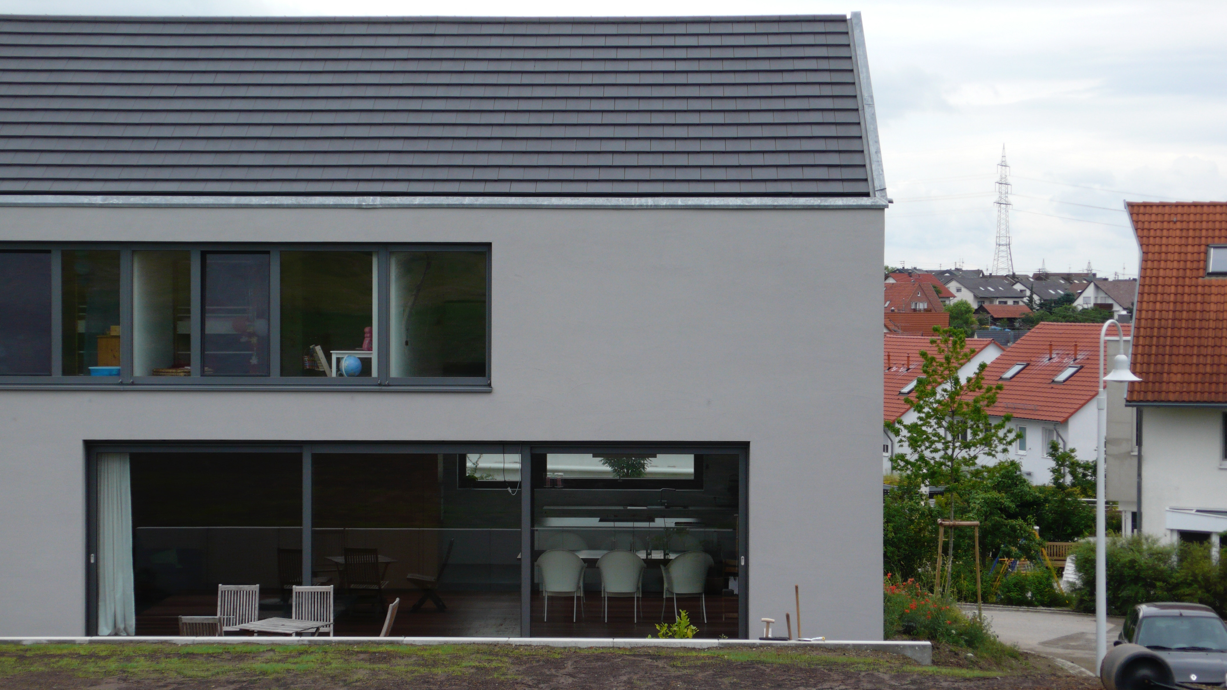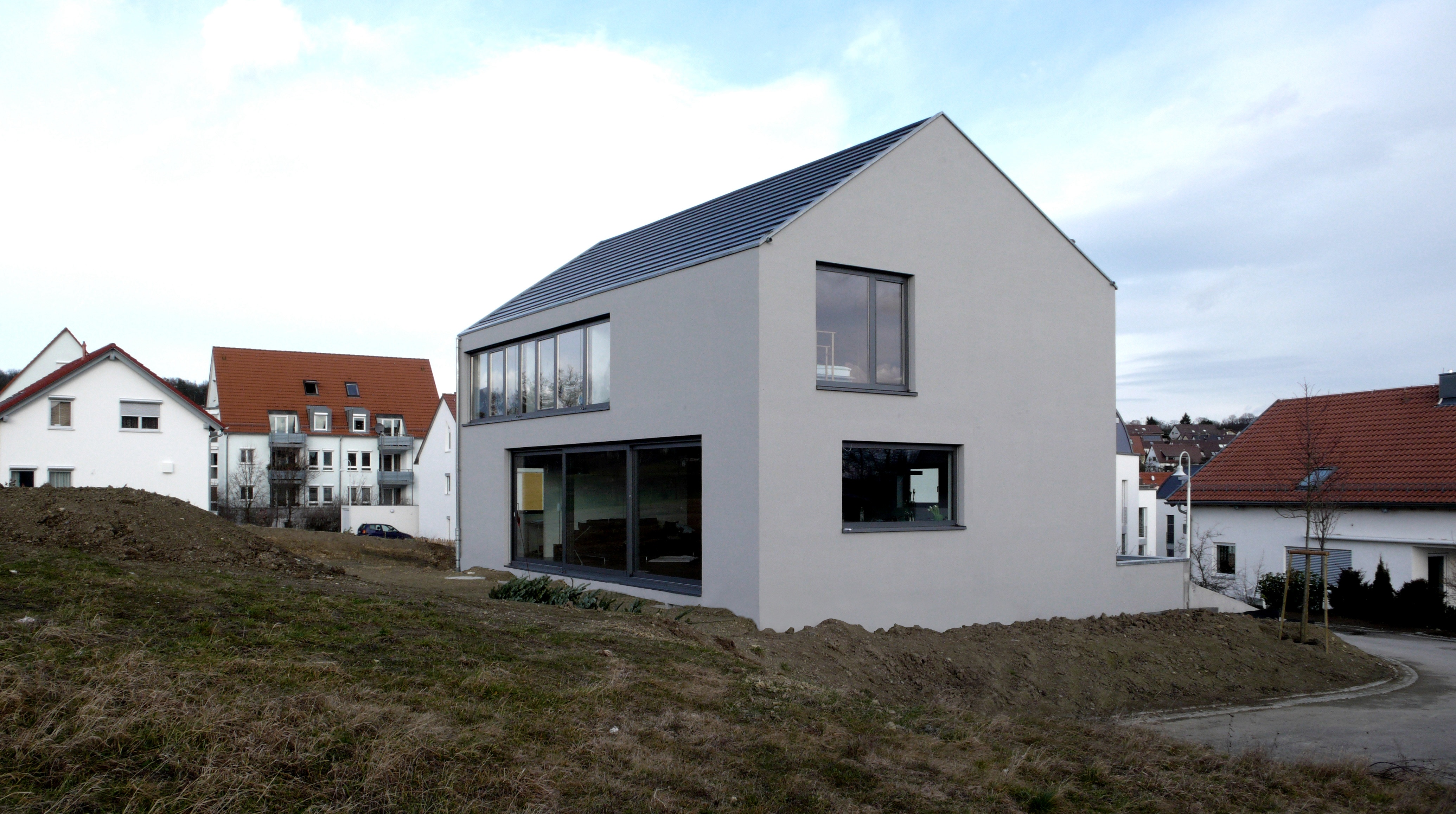 Dachneigung zwischen 27 und 35 Grad, Fensteröffnungen ohne erkennbare Ordnung, Fassadenanstrich in Tarnfarbe, schwarzes Dach. Der großzügige Eingangsbereich mit vollverglaster Fassade und Vorplatz hält den Kontakt zum Umfeld.