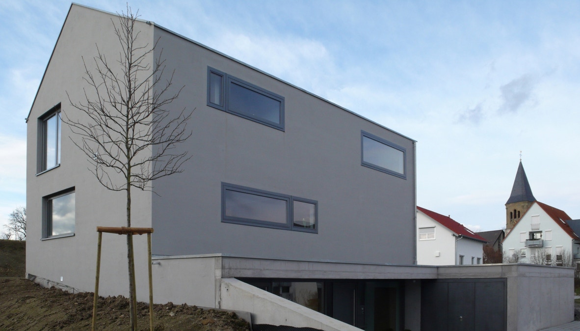 Aus einem Sockelgeschoss erhebt sich ein monolithischer, scharf geschnittener Baukörper mit einer eigenwilligen Tektur: