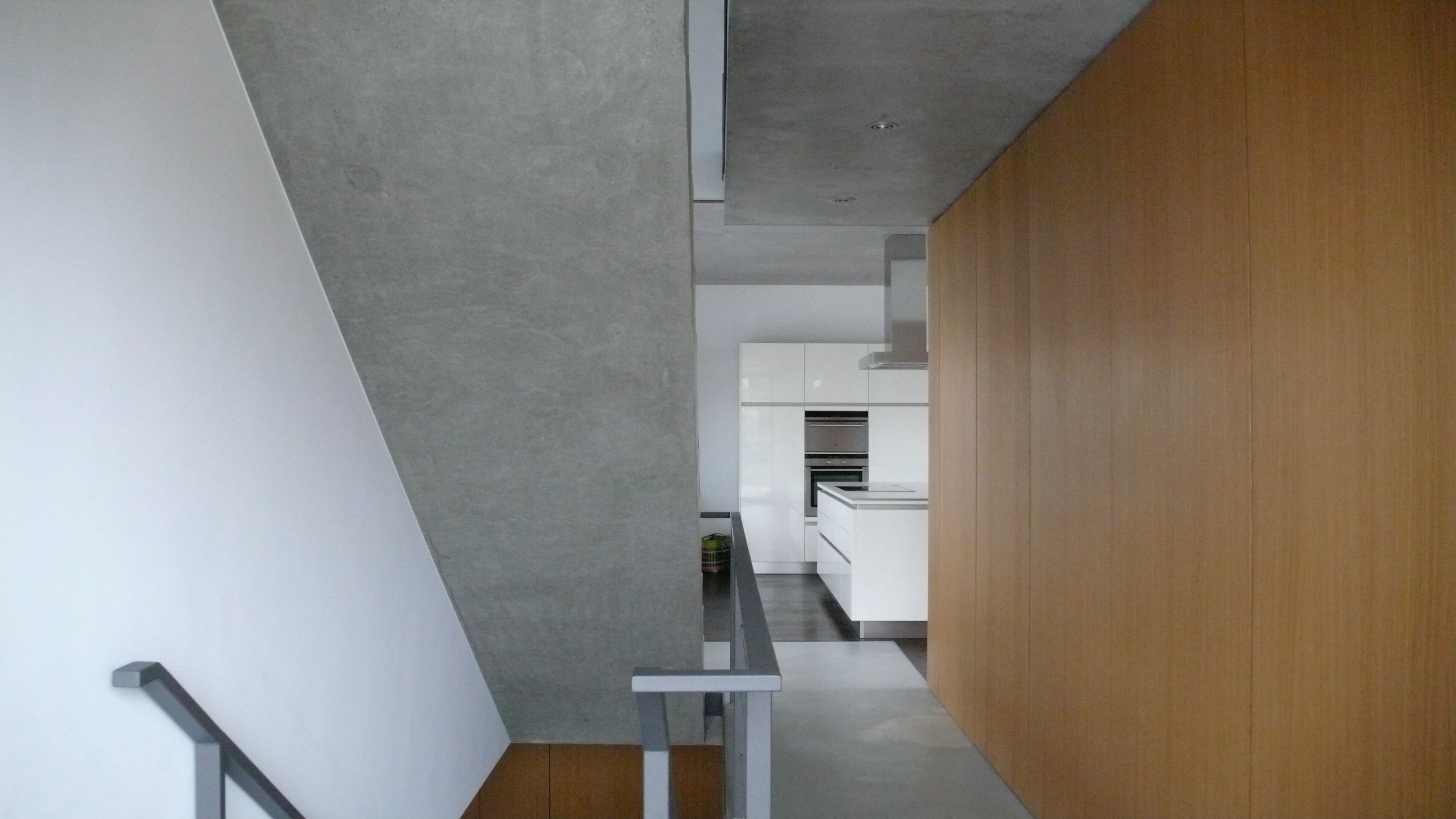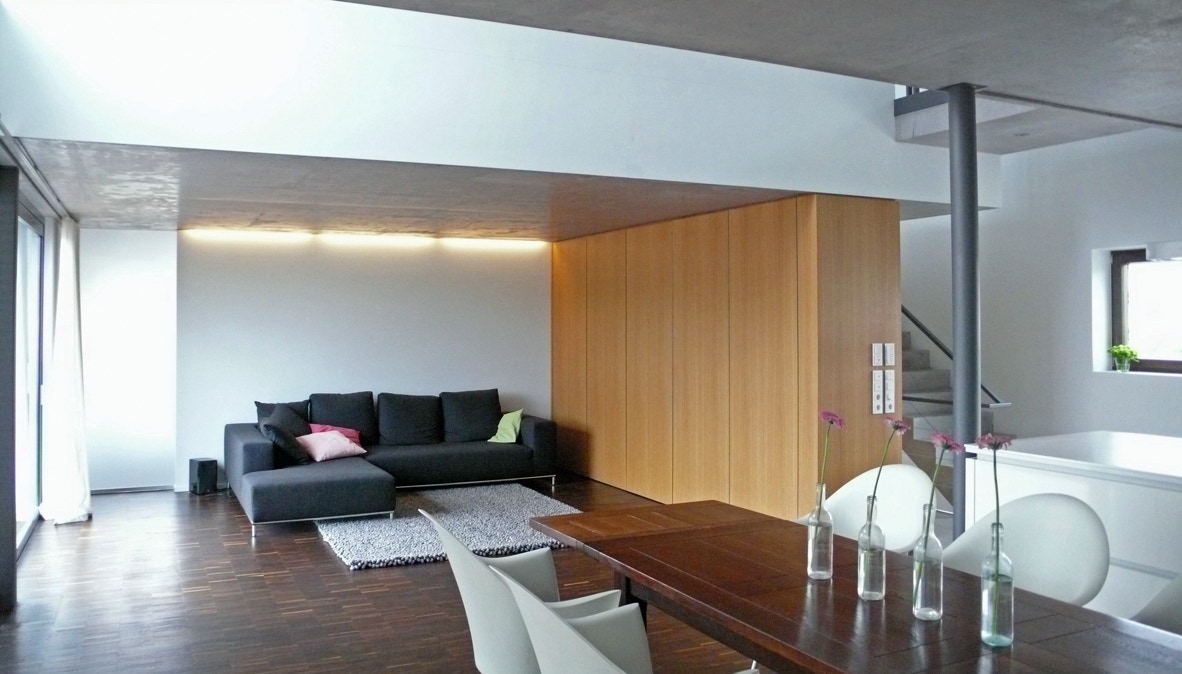 Das Haus ist in zwei Bereiche unterschiedlicher Qualität unterteilt. Ein großer Wohnraum mit Küche und Arbeitsplatz, der sich zum Garten hin öffnet sowie Einzelzimmer für Kinder und Eltern im Obergeschoss. Beide Lebensbereiche sind durch einen Luftraum, der ungewohnte Sichtverbindungen zulässt, verknüpft.