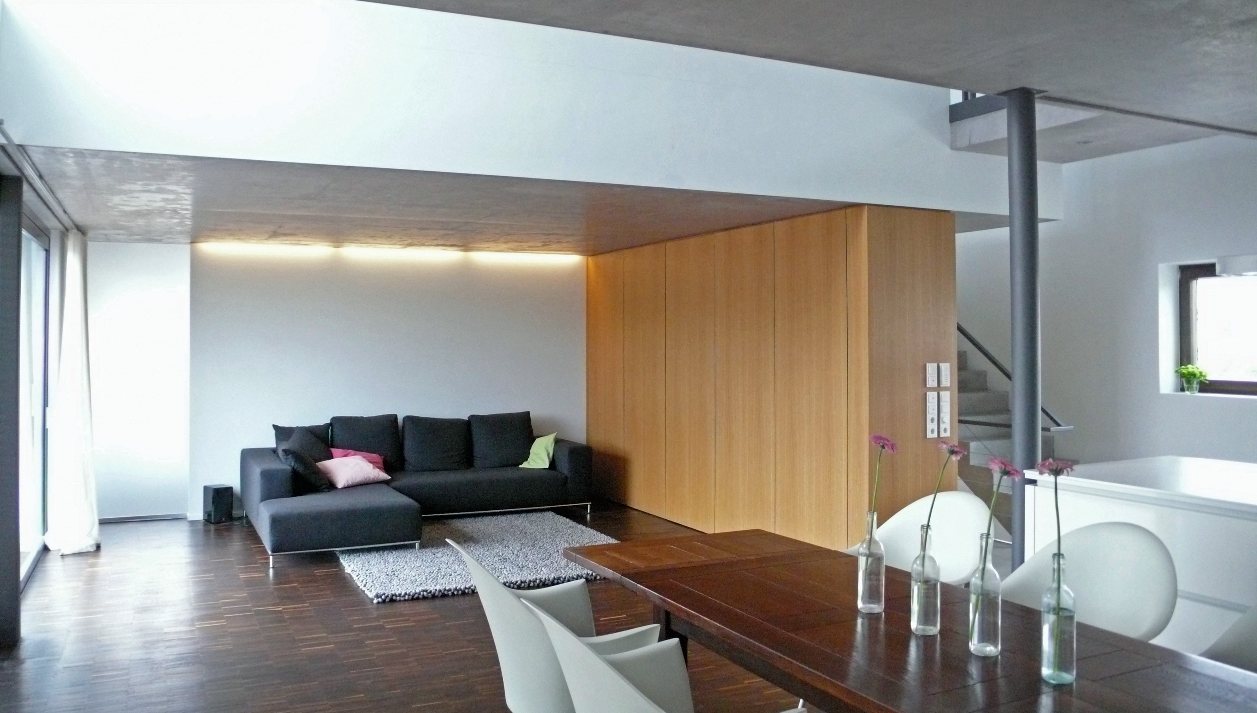 Konstruktion: Massivbau aus Gasbetonsteinen, Massivdach, Sichtbetondecken, Sichtestrich, Parkett, Fussbodenheizung, Geothermie