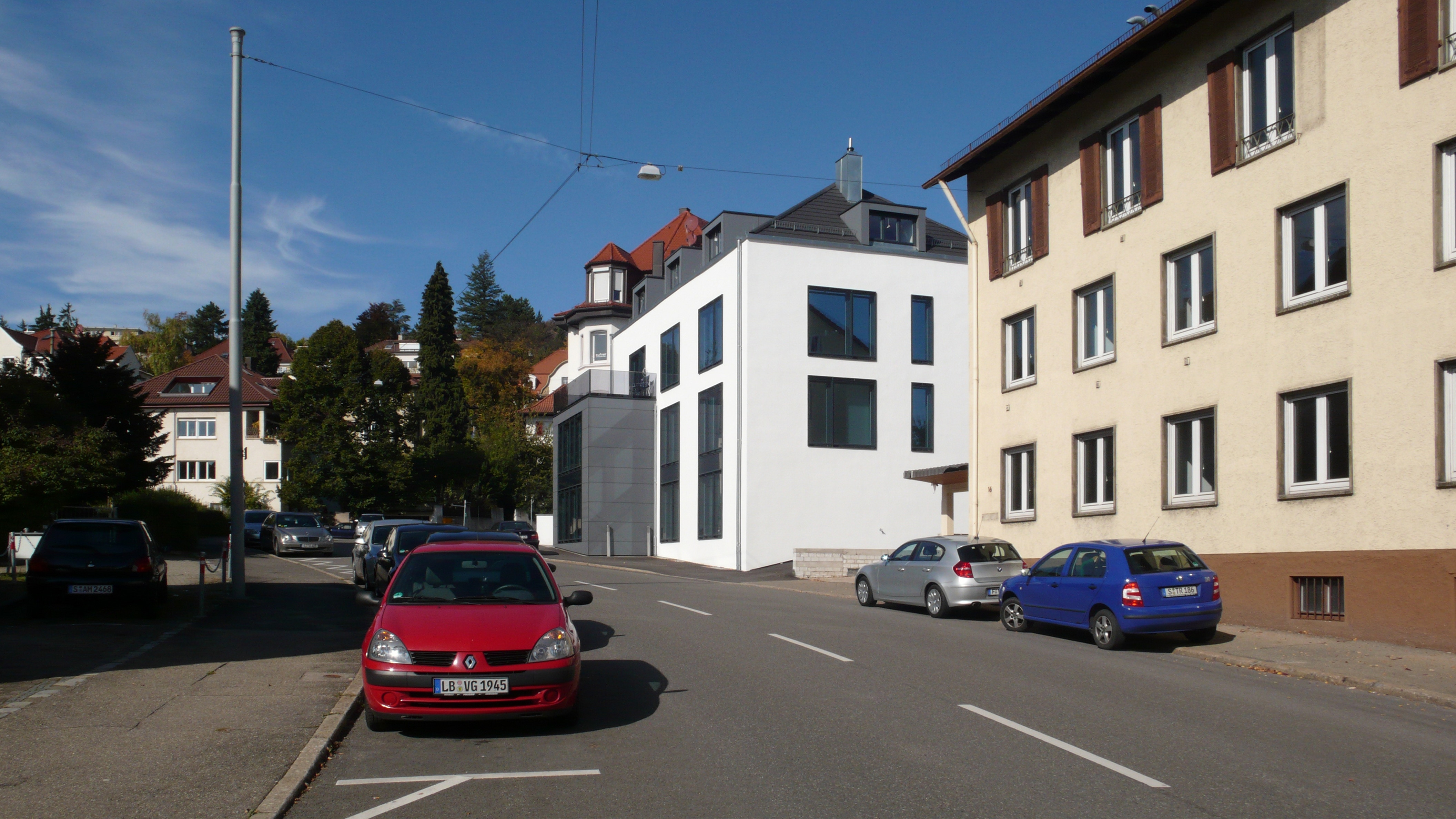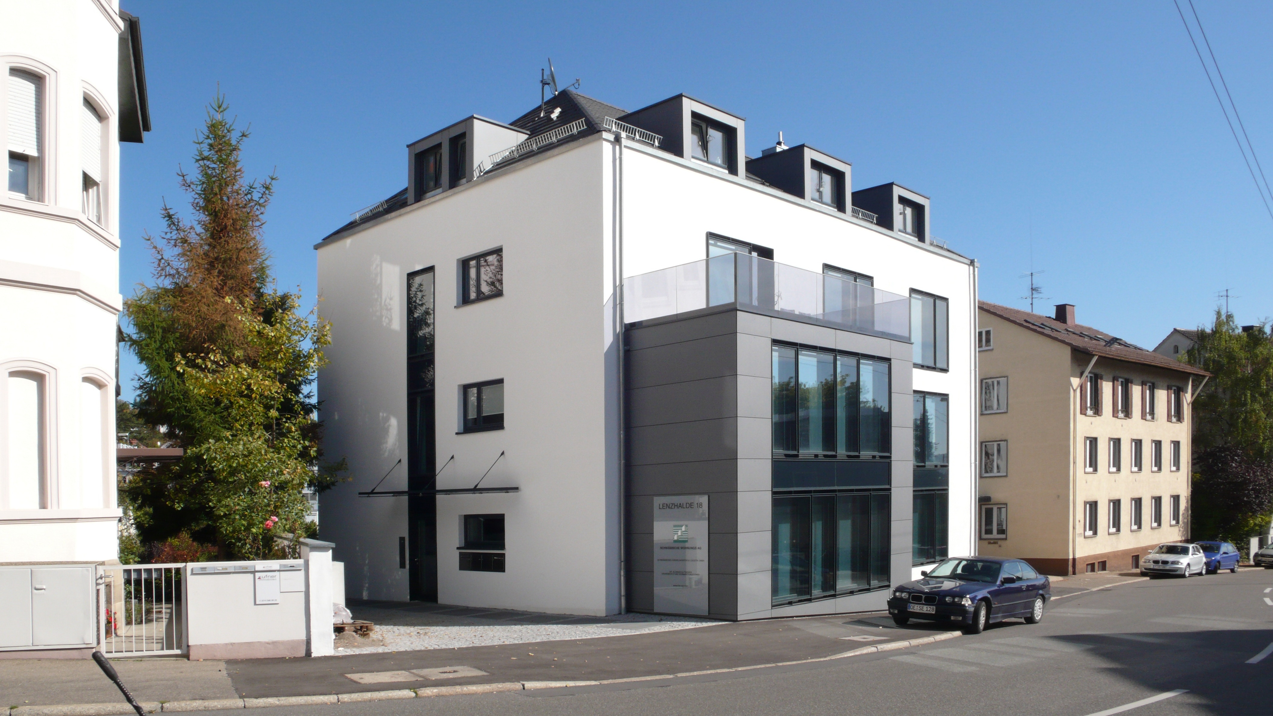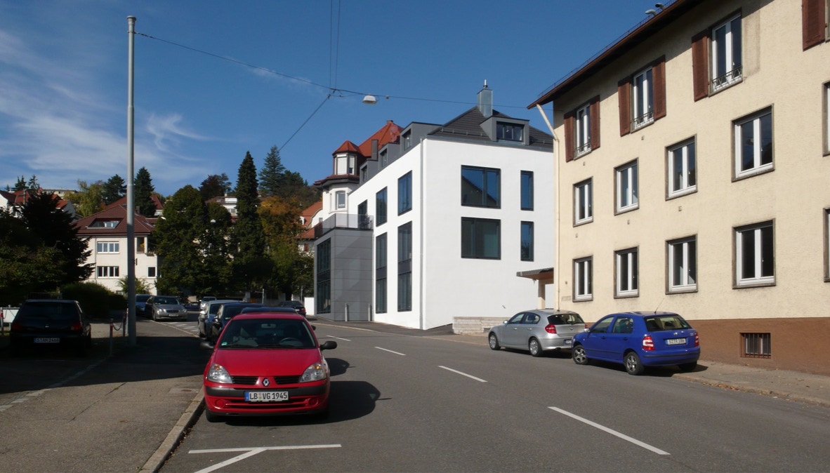 Die Büroeinheit im Erd- und 1. Obergeschoss sowie die zwei Wohnungen im Ober- und Dachgeschoss wurden zur Hangseite neu ausgerichtet, die Hangseite, mit einem schönen Blick über Stuttgart, durch Balkonflächen ergänzt. Auch zur Straßenseite wurden die Fensteröffnungen bodentief aufgebrochen. Vorgehängte Rahmenelemente mit einer fassadenbündig eingelassenen Prallscheibe filtern den Verkehrslärm der stark befahrenen Lenzhalde.