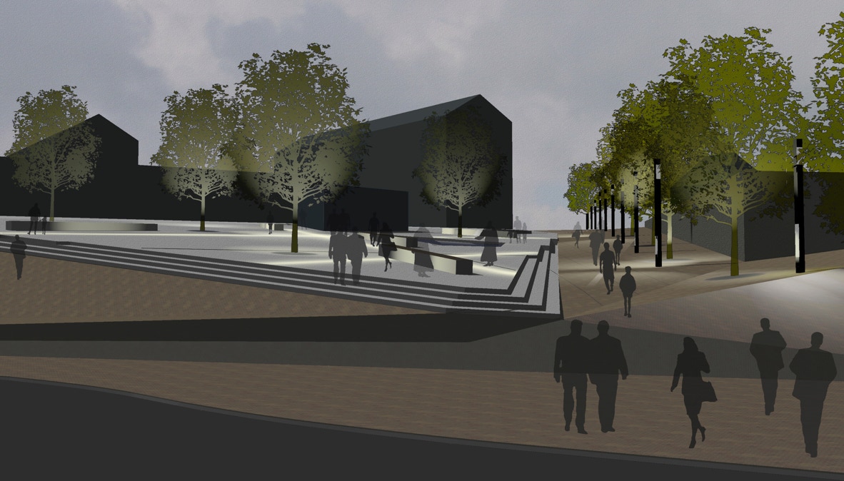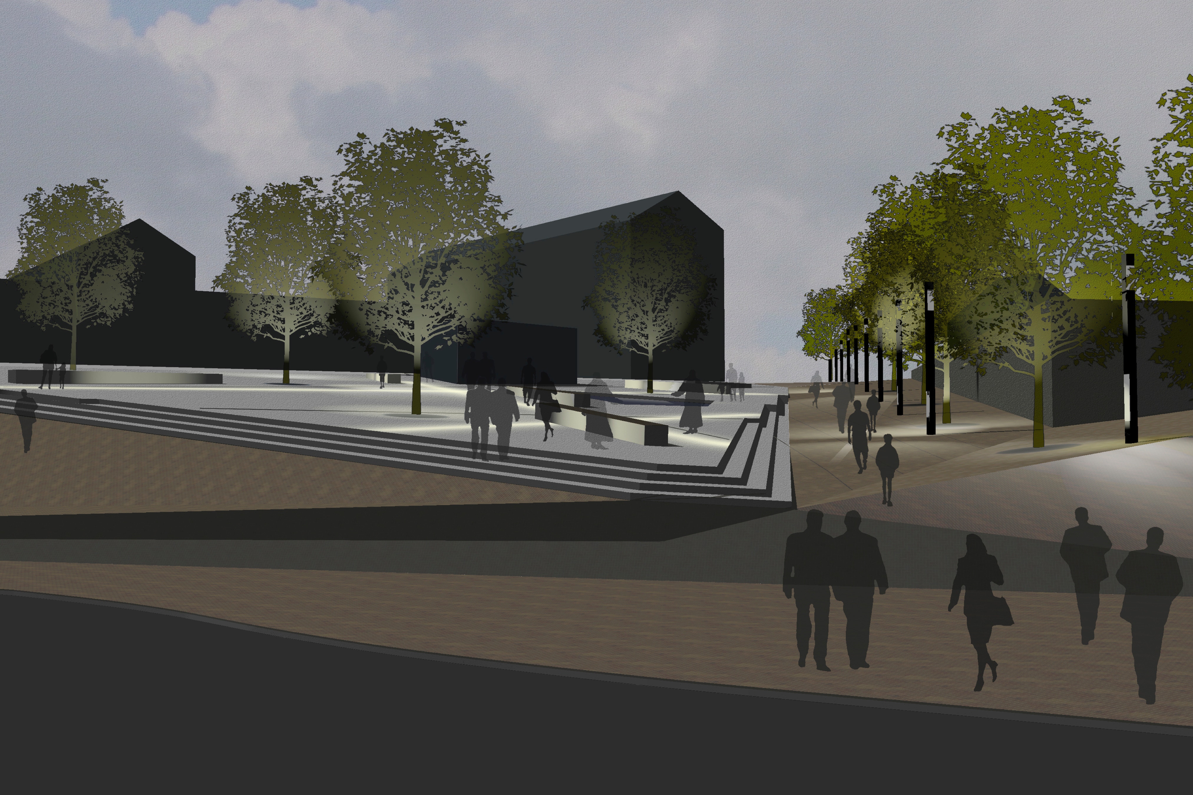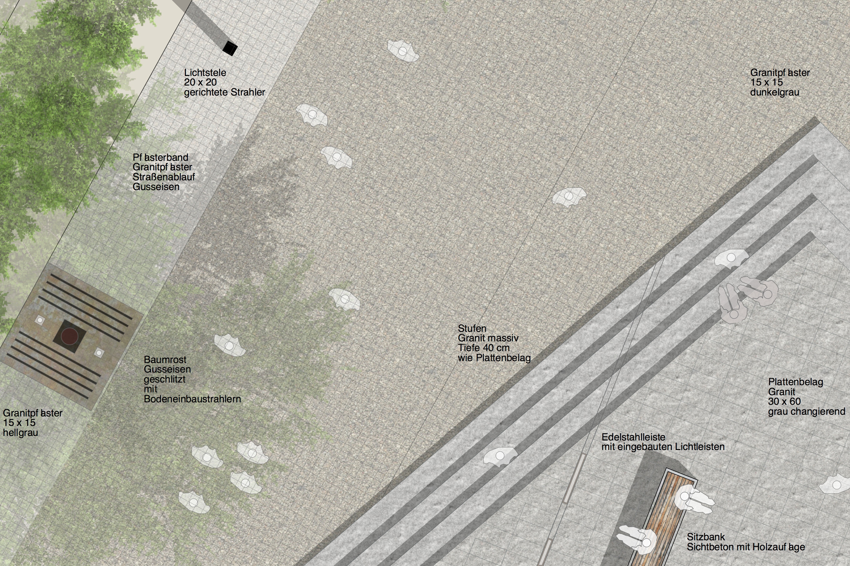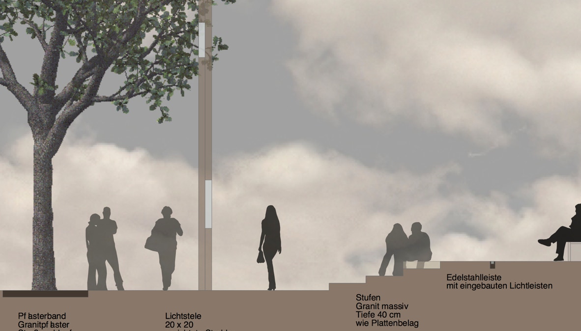 Der Hauptzugang am Braker Weg wird durch eine leicht geneigte, dreieckige Platzfläche gekennzeichnet. Stufen entlang der Wegeverbindungen machen die Platzfläche erlebbar und bieten Sitzgelegenheiten zum Verweilen. Auf der Westseite des Platzes entlang der Raumkante entsteht eine Achse, die den Übergang "Bahnhaltestelle" und den Anschlusspunkt "Johannes-Schuchen-Straße" direkt miteinander verknüpft.