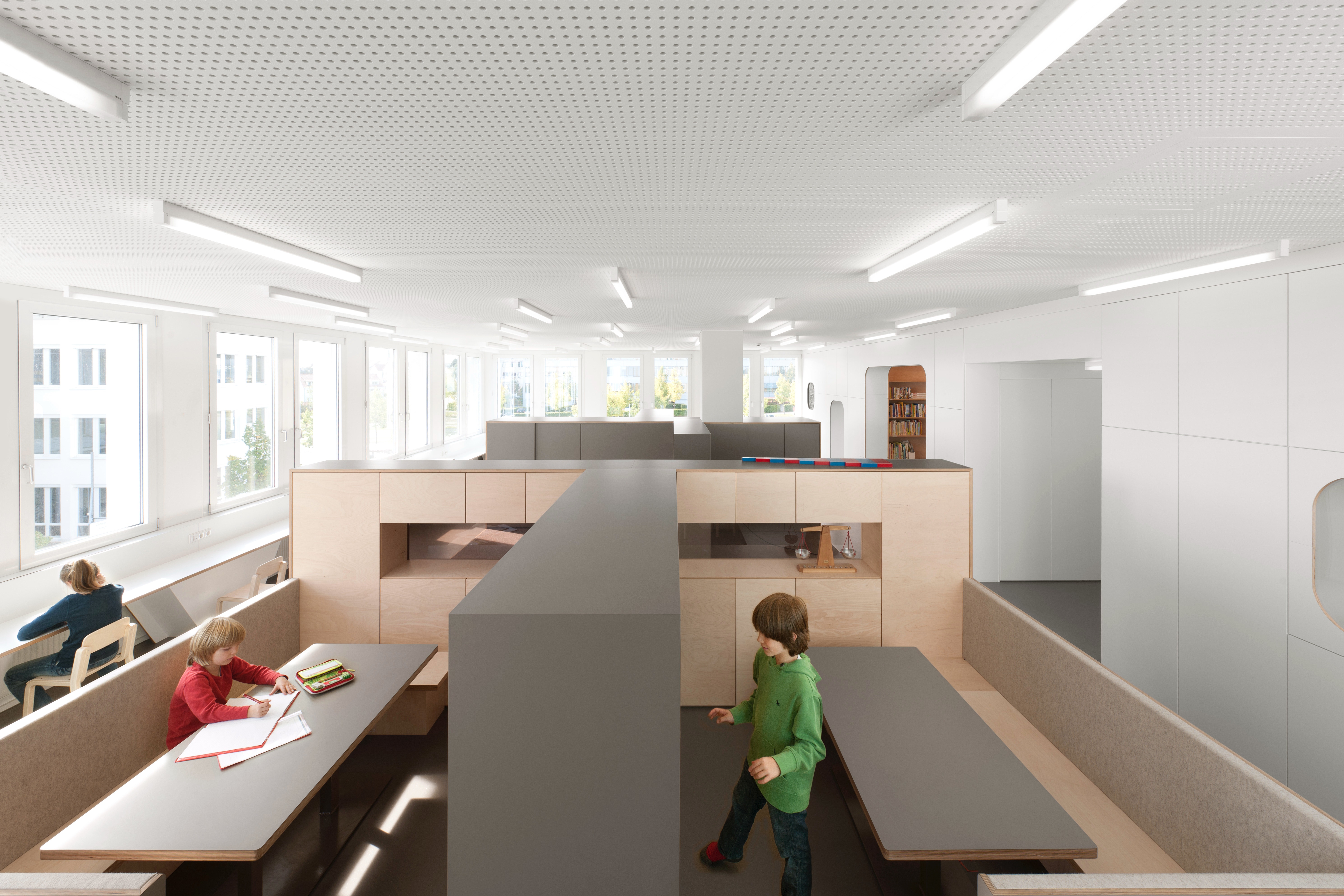 Die zur Verfügung stehende Bürofläche wurde bis auf die Technikkerne komplett entkernt. Es entstanden zwei große Räume, in denen freistehende Einbauten, entsprechend dem pädagogischen Konzept der Schule, unterschiedliche Tätigkeiten unterstützen. Der Aktionsbereich, mit Garderobe, Labor, Atelier und Bewegungsraum sowie der Arbeitsbereich mit zwei differenziert ausgestatteten Lerninseln. Eine raumhohe Schrankwand bietet mit eingebauten Raumnischen (Lesehöhle, Zirbelstube) Rückzugs- und Ruheräume an. Entlang der Fassade befinden sich umlaufend die Einzelarbeitsplätze in unterschiedlicher Höhe, so dass sitzend oder stehend auch individuell gearbeitet werden kann.