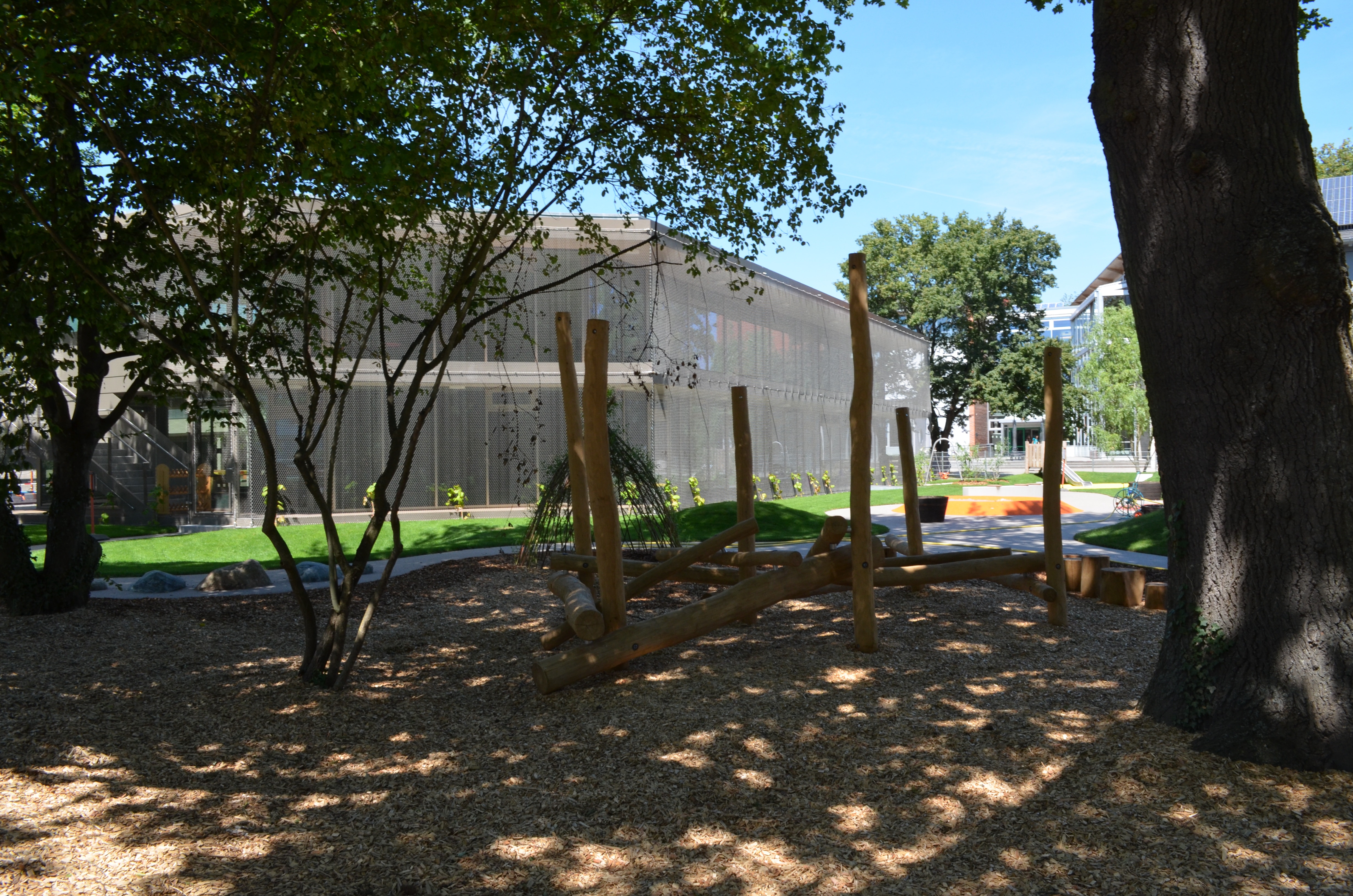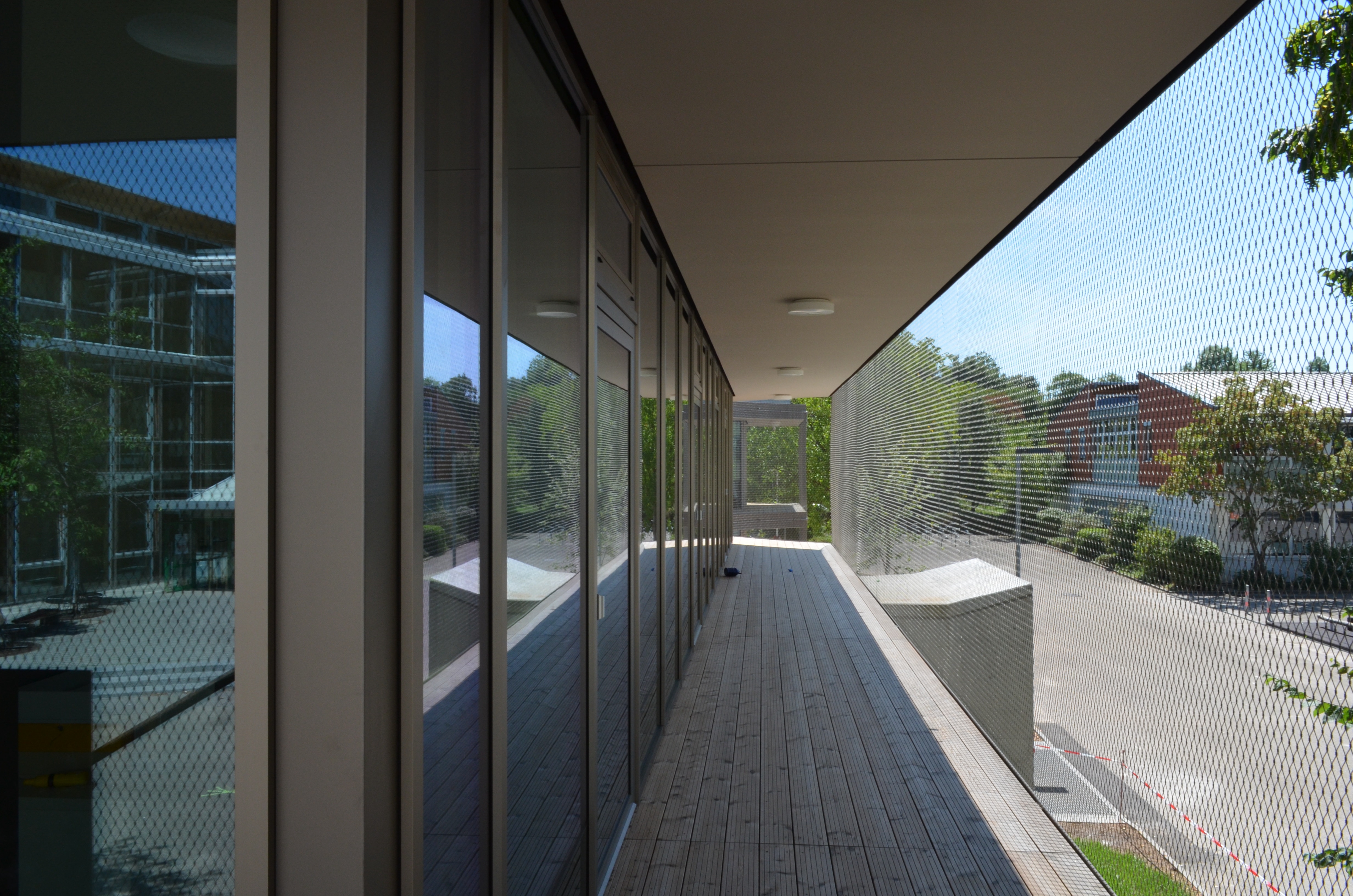 Aus dem so entwickelten klaren, scharfkantigen Baukörper mit einer dominanten Schichtung der Geschosse, wurden Kreissegmente herausgeschnitten, um den alten Baumbestand zu berücksichtigen und in das Gebäude zu integrieren. Um das gesamte Gebäude ist ein Netz aus Edelstahl geschlungen. Dies dient bei freiem Ausblick (auch für Kinder) der Absturzsicherung. Das Netz wurde begrünt und schützt so den Innenraum zusätzlich vor Sonneneinstrahlung.