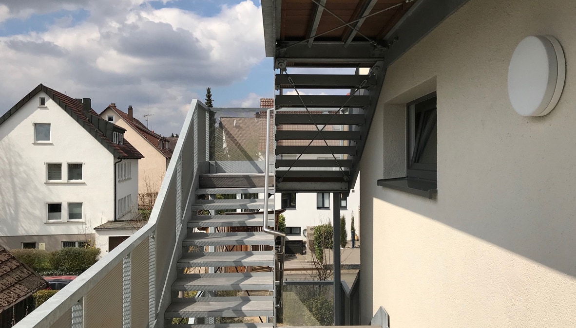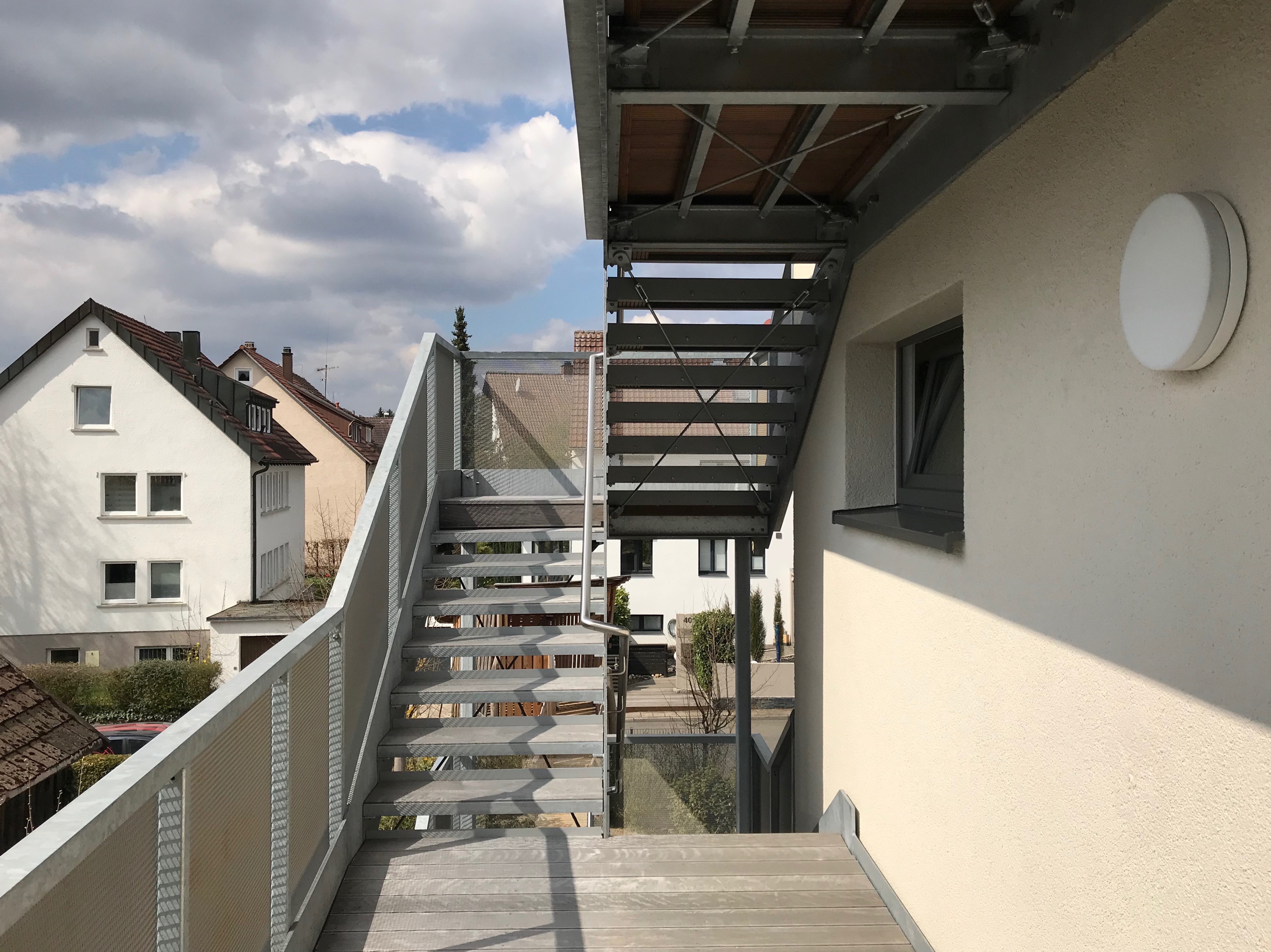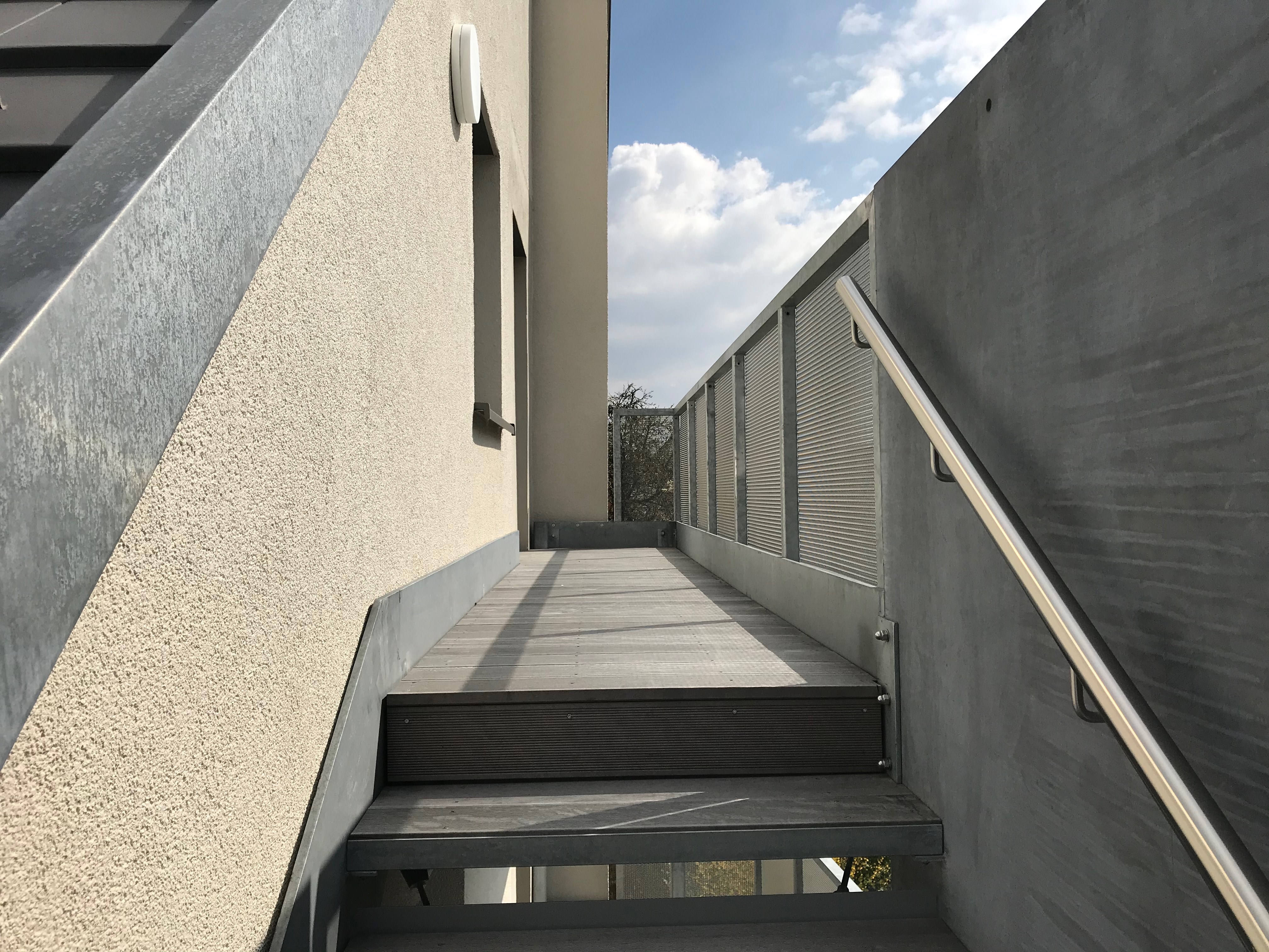 Die der Südfassade vorgelagerte Treppenanlage dient als zweiter baulicher Rettungsweg, erweitert aber auch gleichzeitig die Innenräume um weitere Balkonflächen, die geschossübergreifend in die Nutzung integriert werden können und dient zudem als Sonnenschutz. Blechpanele aus kleinmaschigem Streckmetall prägen das Erscheinbild. Je nach Blickwinkel und Sonnenstand wirkt der Baukörper mal geschlossen, mal transparent.