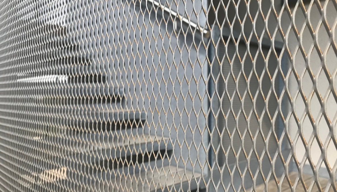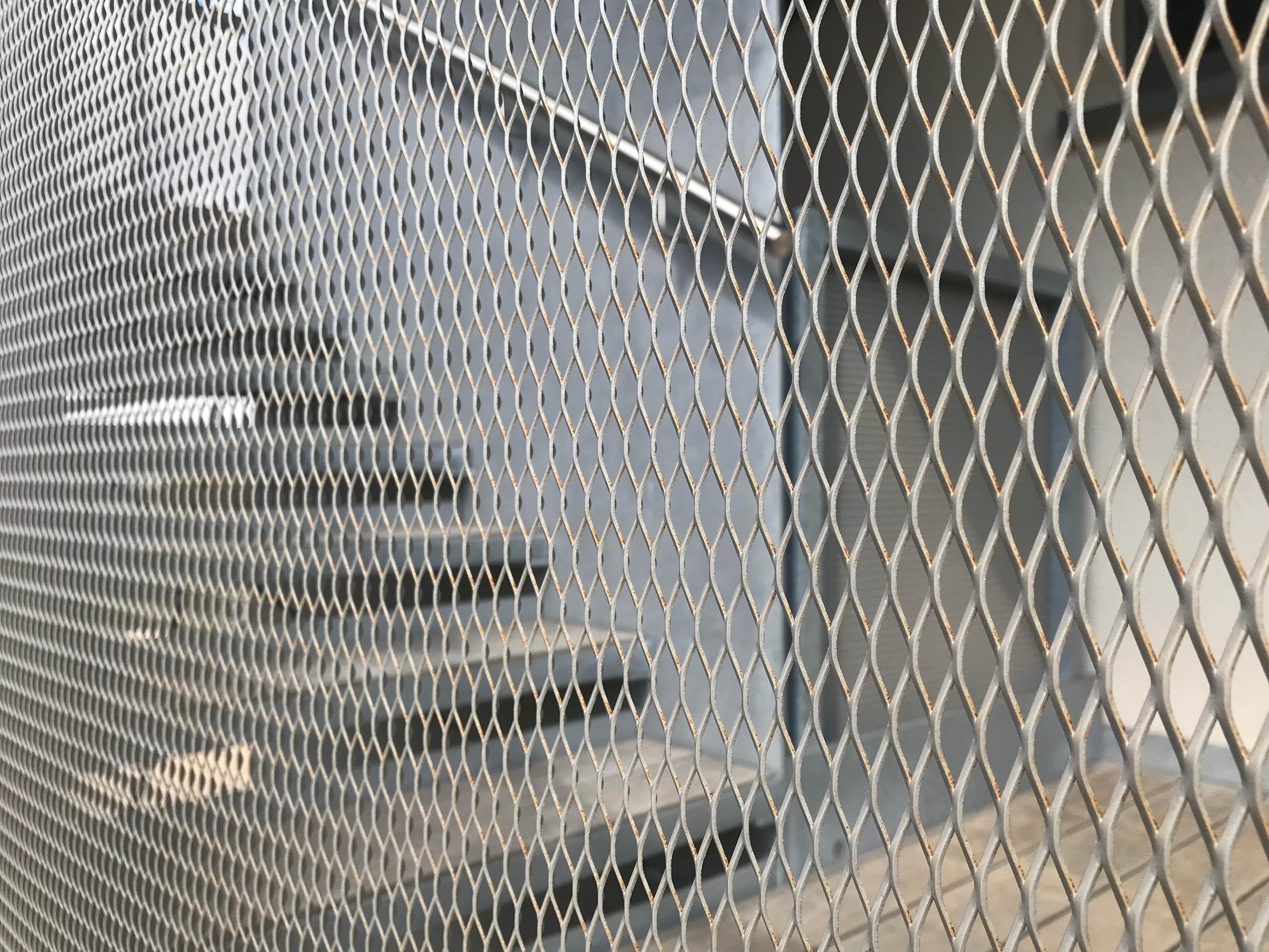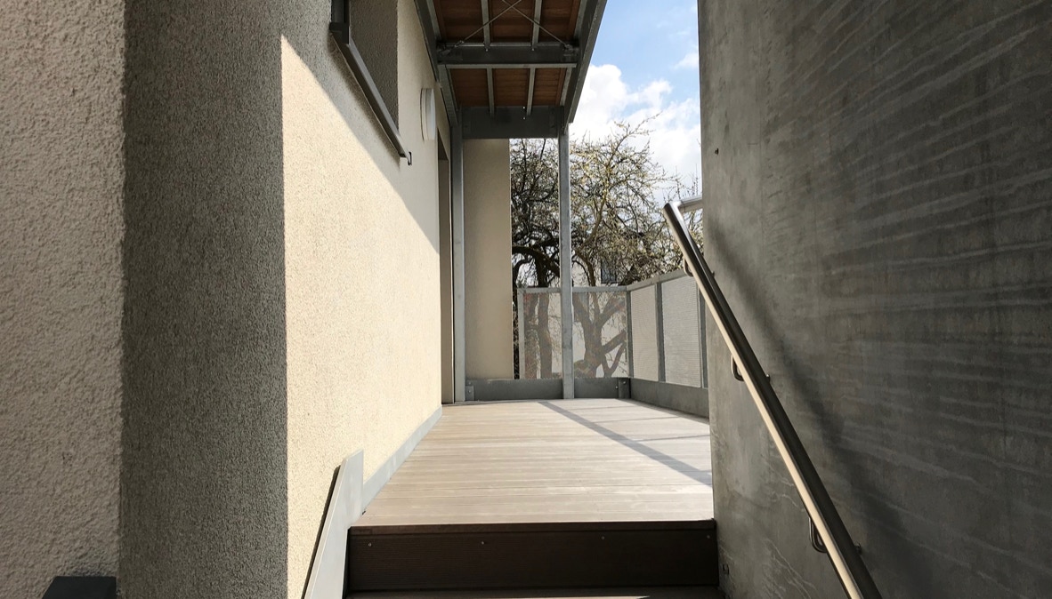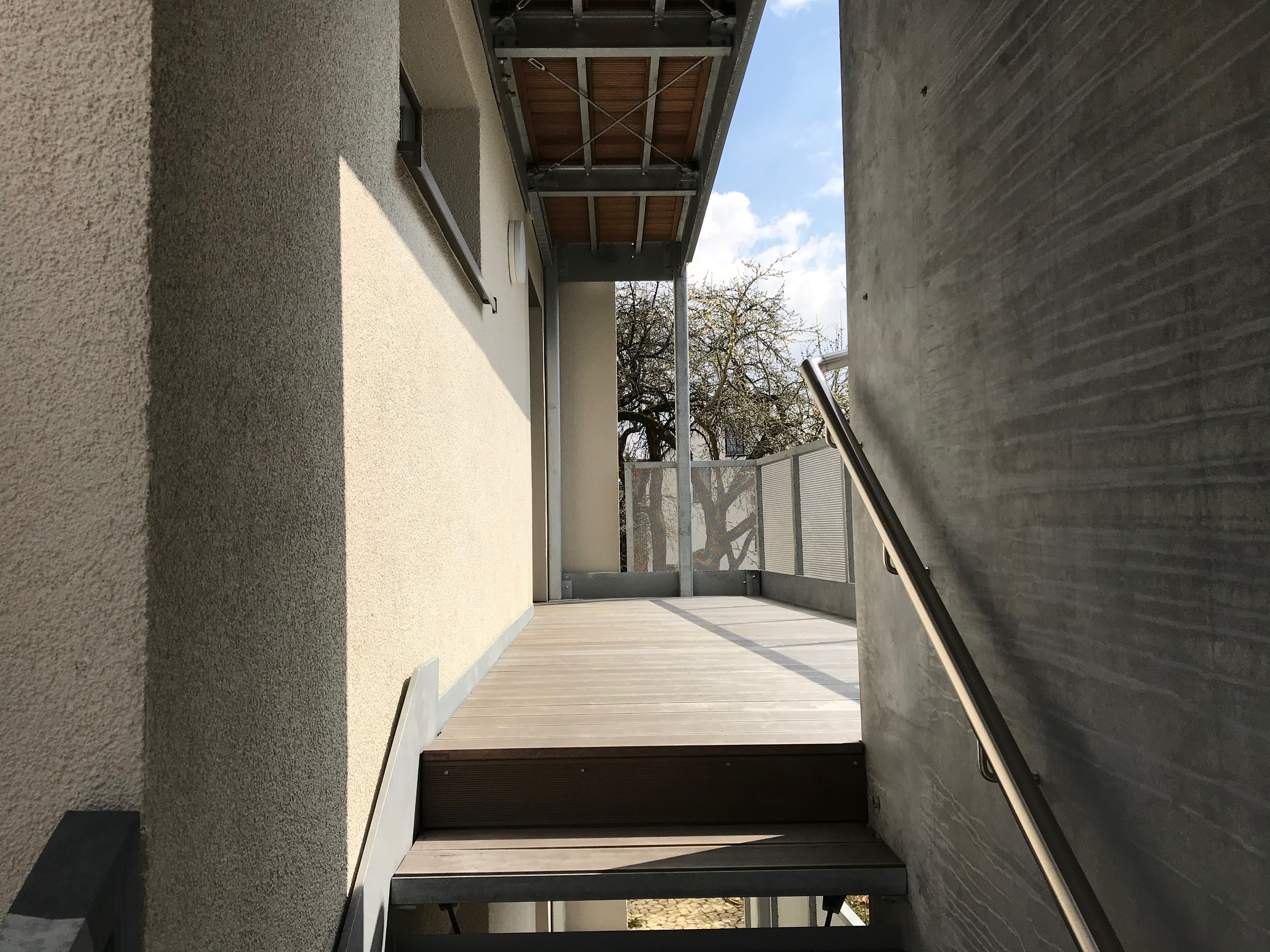 Die der Südfassade vorgelagerte Treppenanlage dient als zweiter baulicher Rettungsweg, erweitert aber auch gleichzeitig die Innenräume um weitere Balkonflächen, die geschossübergreifend in die Nutzung integriert werden können und dient zudem als Sonnenschutz. Blechpanele aus kleinmaschigem Streckmetall prägen das Erscheinbild. Je nach Blickwinkel und Sonnenstand wirkt der Baukörper mal geschlossen, mal transparent.