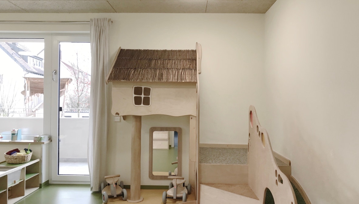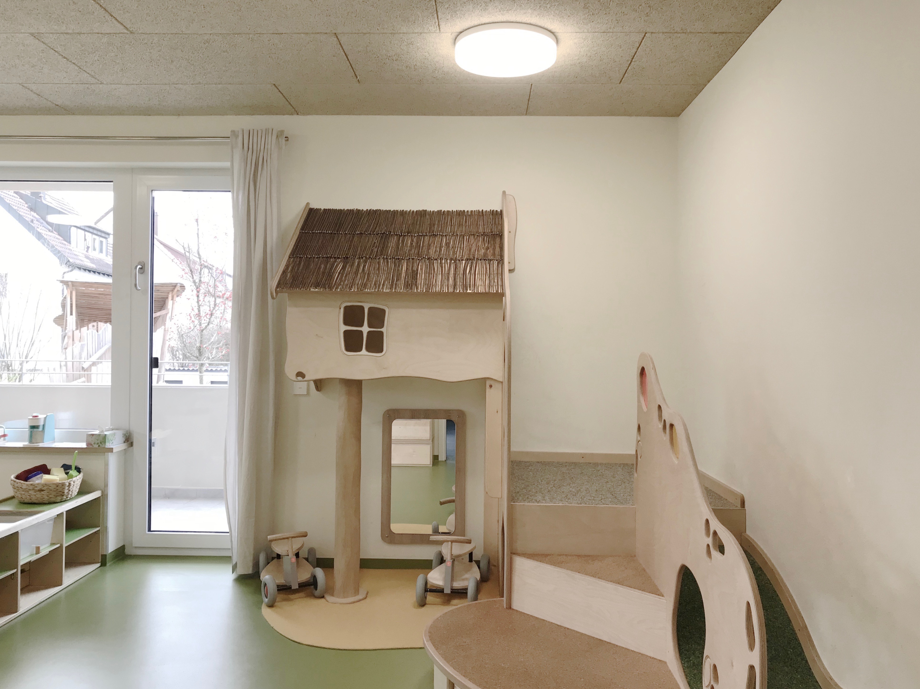 Das Wohnhaus aus den 60er wurde entkernt, saniert und zu einer Kindertagesstätte für 60 Kinder ausgebaut.
