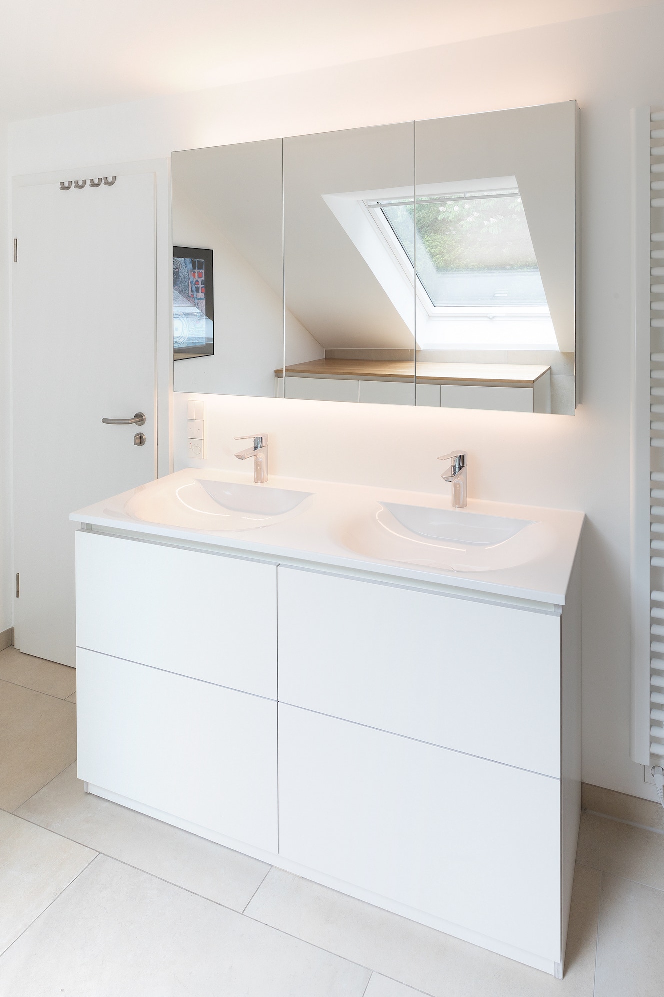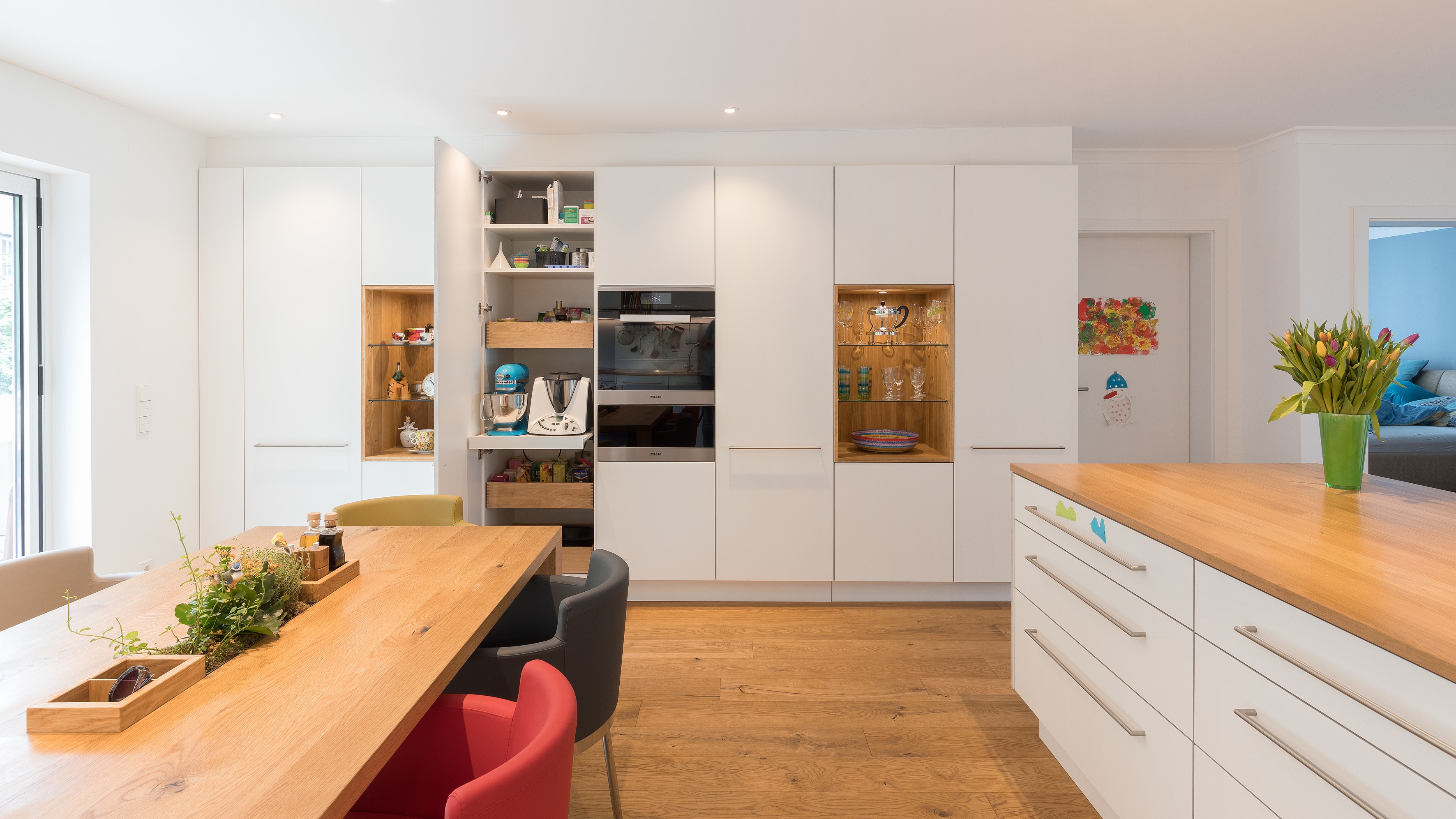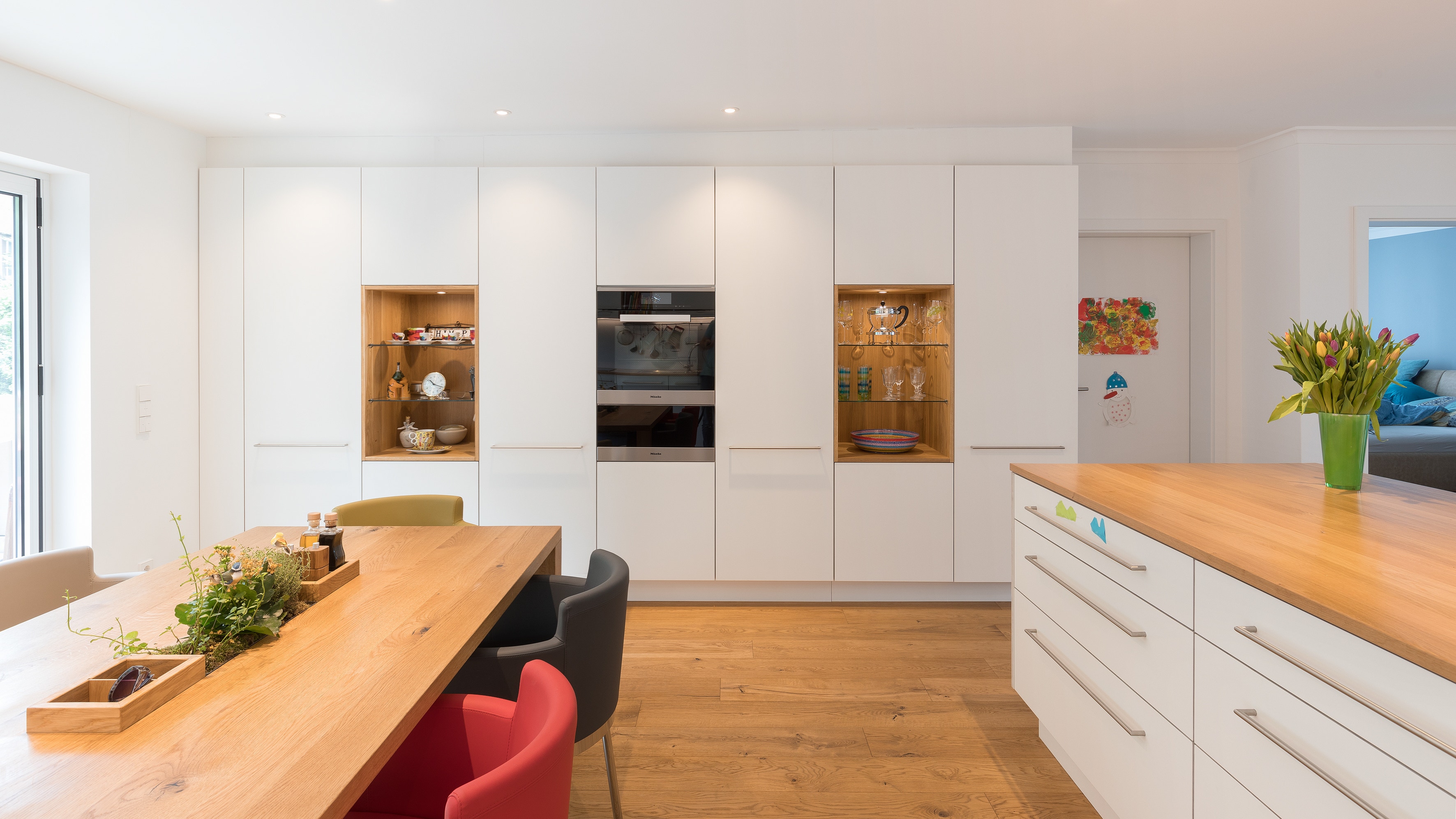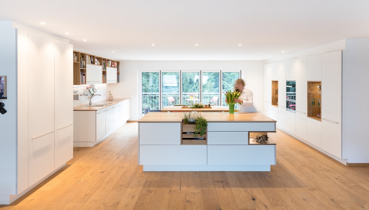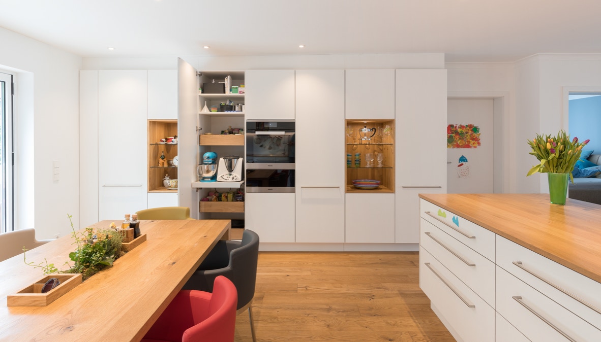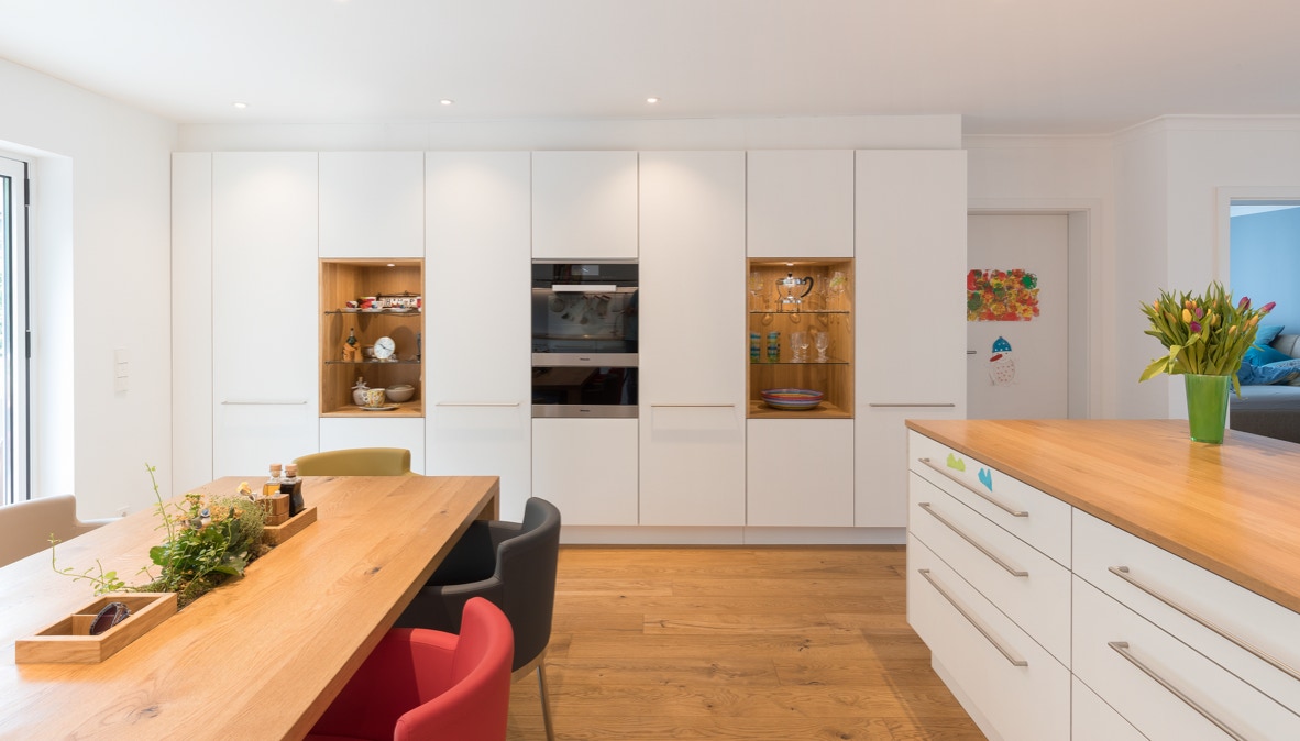 Konstruktion: Möblierung Multiplex weiss beschichtet, Eichenholz massiv, Parkett, Fussbodenheizung