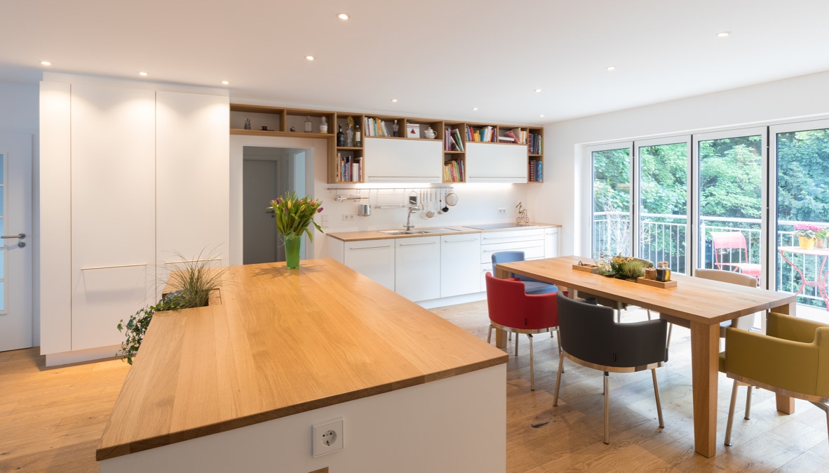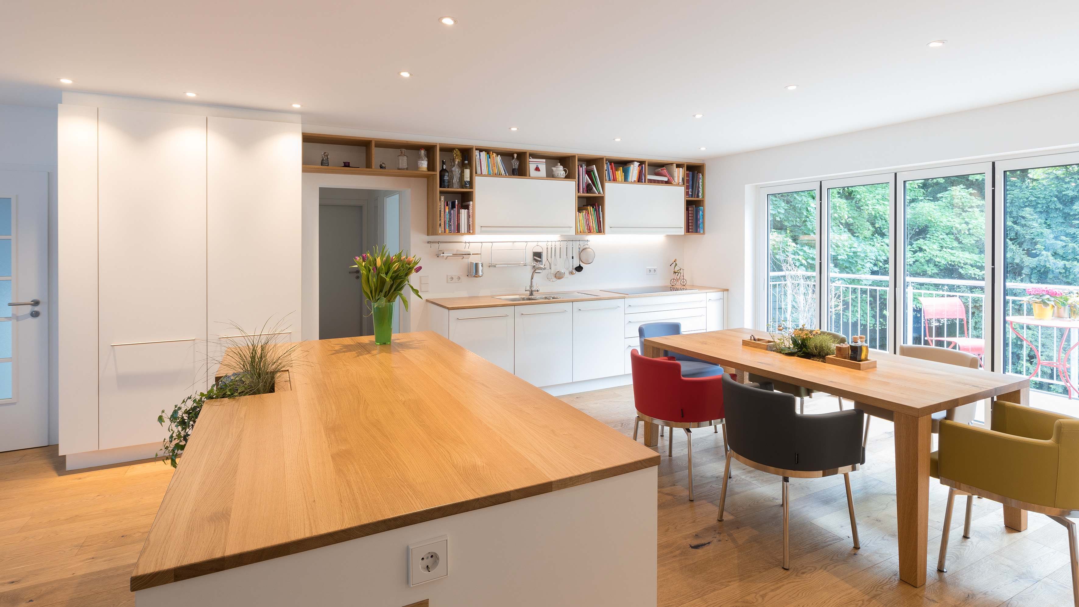 Der Wohn- und Essbereich wird zum Zentrum der 3-Zimmer-Wohnung. Er erstreckt sich über die gesamte Tiefe des Gebäudes, ist Diele, Wohnraum und Küche zugleich. Zur Gartenseite lässt sich der Raum über eine faltbare Glaswand zur vorgelagerten Balkonfläche öffnen.