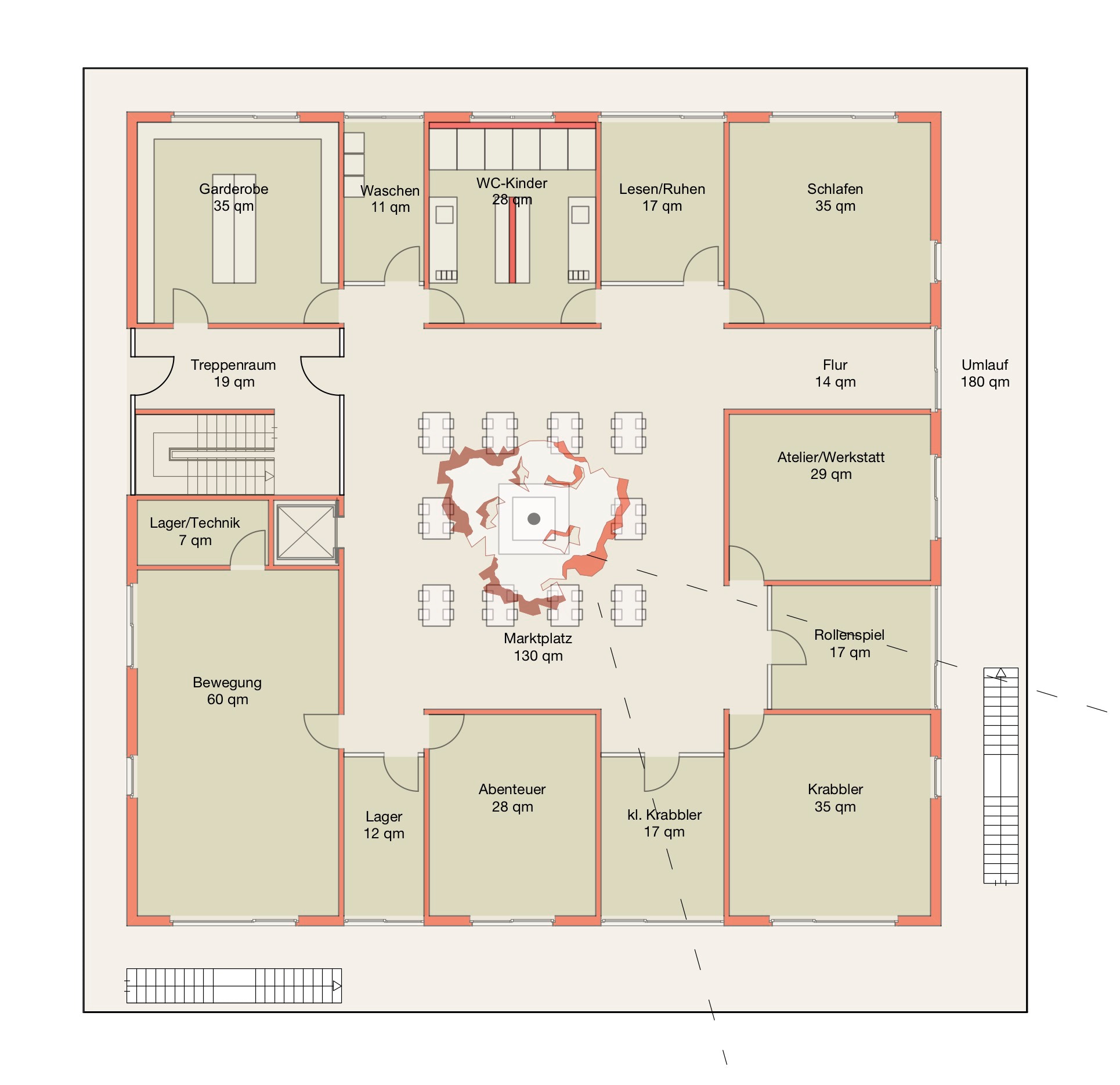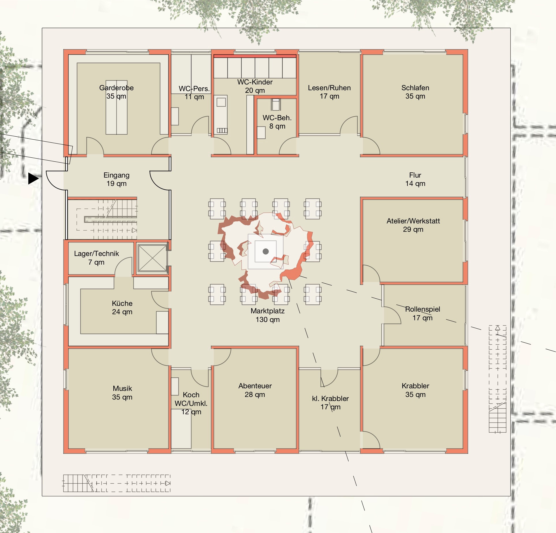 Der Entwurf sieht an gleicher Stelle einen quadratischen, zweigeschossigen Kita-Neubau vor, der Platz für insgesamt 80 Kinder bietet. Der Baukörper nimmt die Raumkanten der Nachbarbebauung auf, definiert sich aber als Solitär mit eigener Tektur. Ein Umlauf im ersten Geschoss dient als Rettungsweg, Spielfläche und Verschattungselement. Zwischen Umlauf und auskragendem Dach spannt sich eine Gewebe aus Metall.